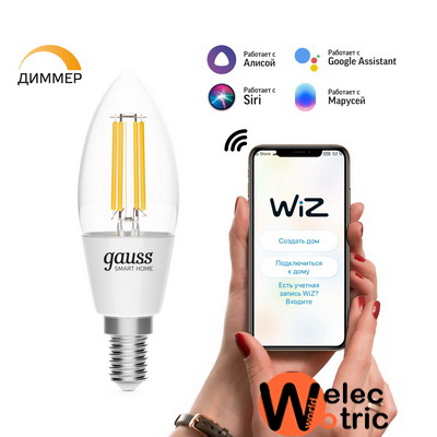 Филаментная лампа с Wi-Fi умная система Gauss Light DIM E14 C35 4,5 Вт 2700-6500K, диммируемая, управление голосом/смартфоном